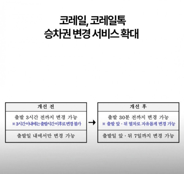 코레일이 승차권 변경 서비스를 확대합니다. 기존에는 출발 3시간 전까지만 변경이 가능했지만, 앞으로는 출발 30분 전까지 변경할 수 있습니다.
