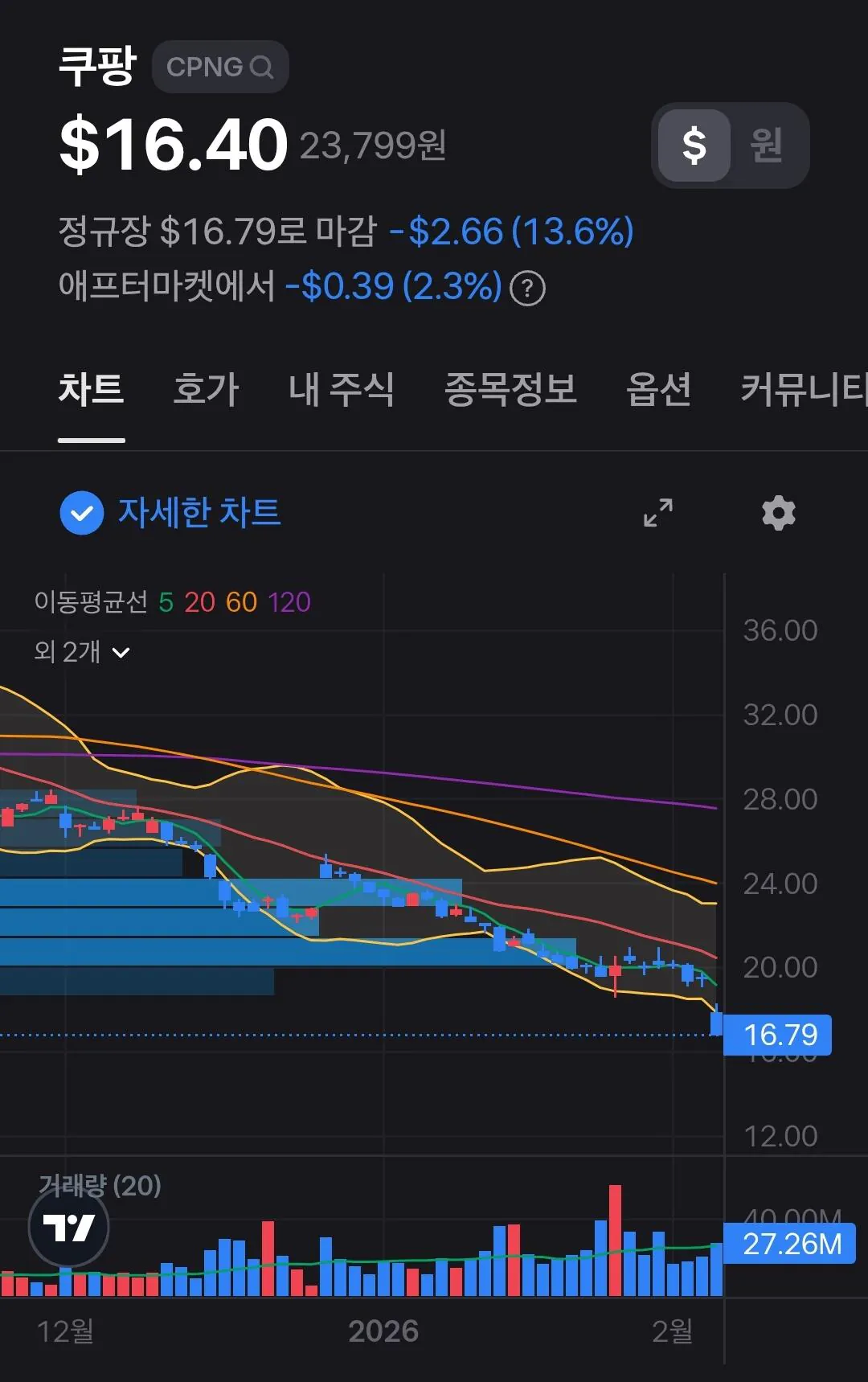 오늘 새벽 폭락한 쿠팡 주가 근황
