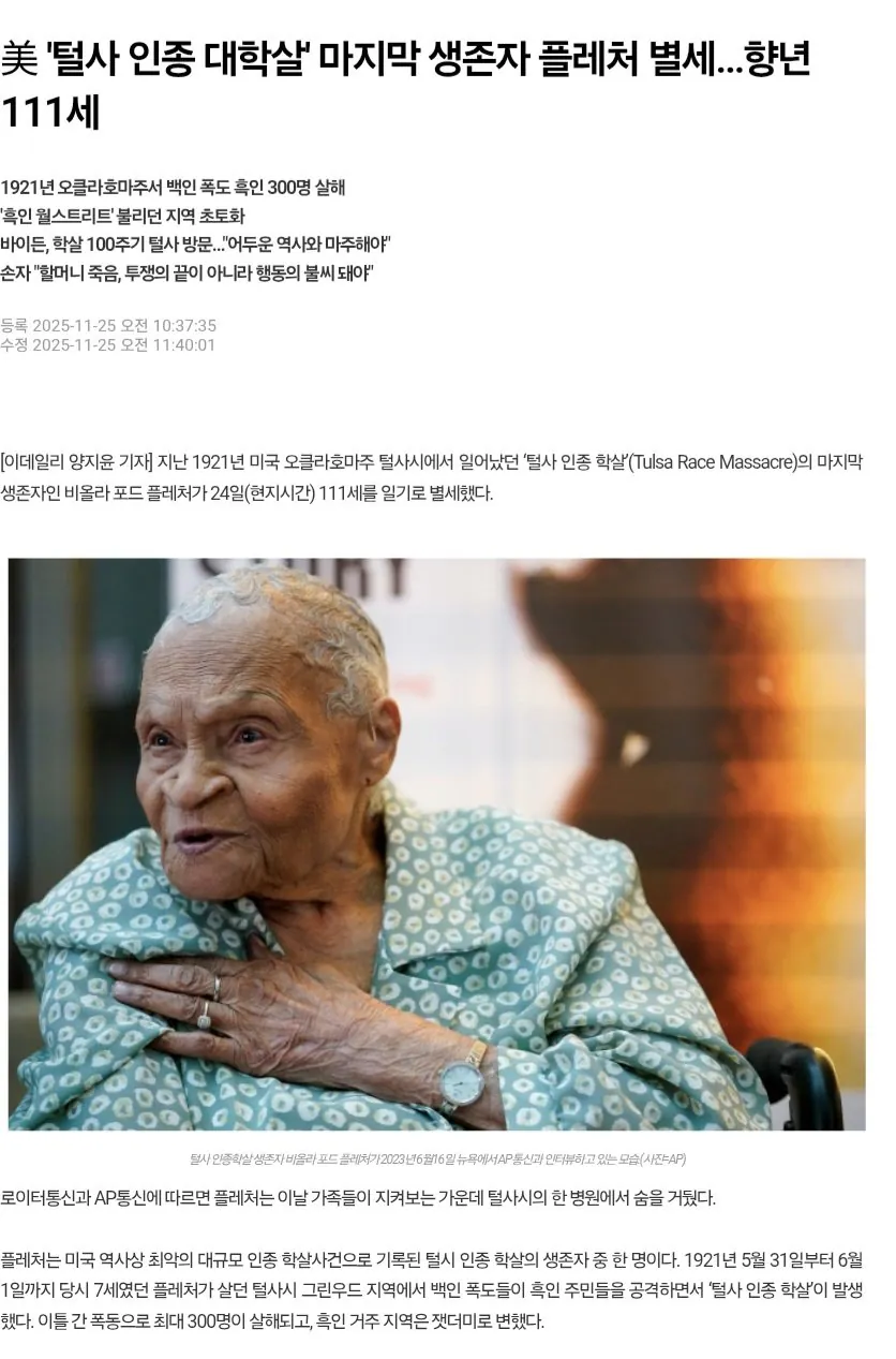 2개월 보름쯤 전에 털사 인종 학살 마지막 생존자 사망.