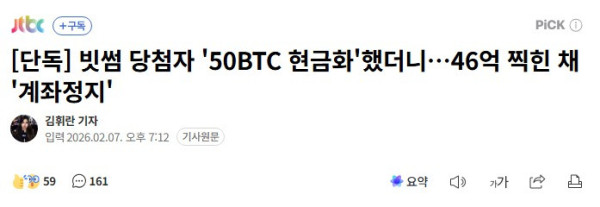 빗썸 당첨자 '50BTC 현금화'했더니…46억 찍힌 채 '계좌정지'