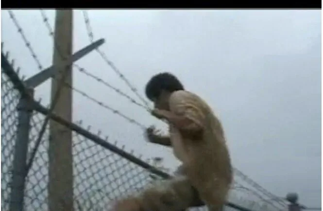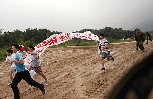 구호를 외치며 철조망을 넘어 진입하려다 출동한 경찰에 체포되며