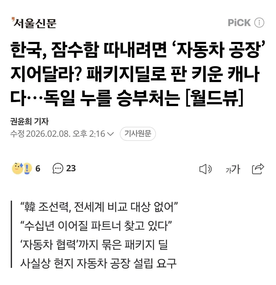 잠수함 판매 위해선 자동차 공장도 캐나다에 지어라
