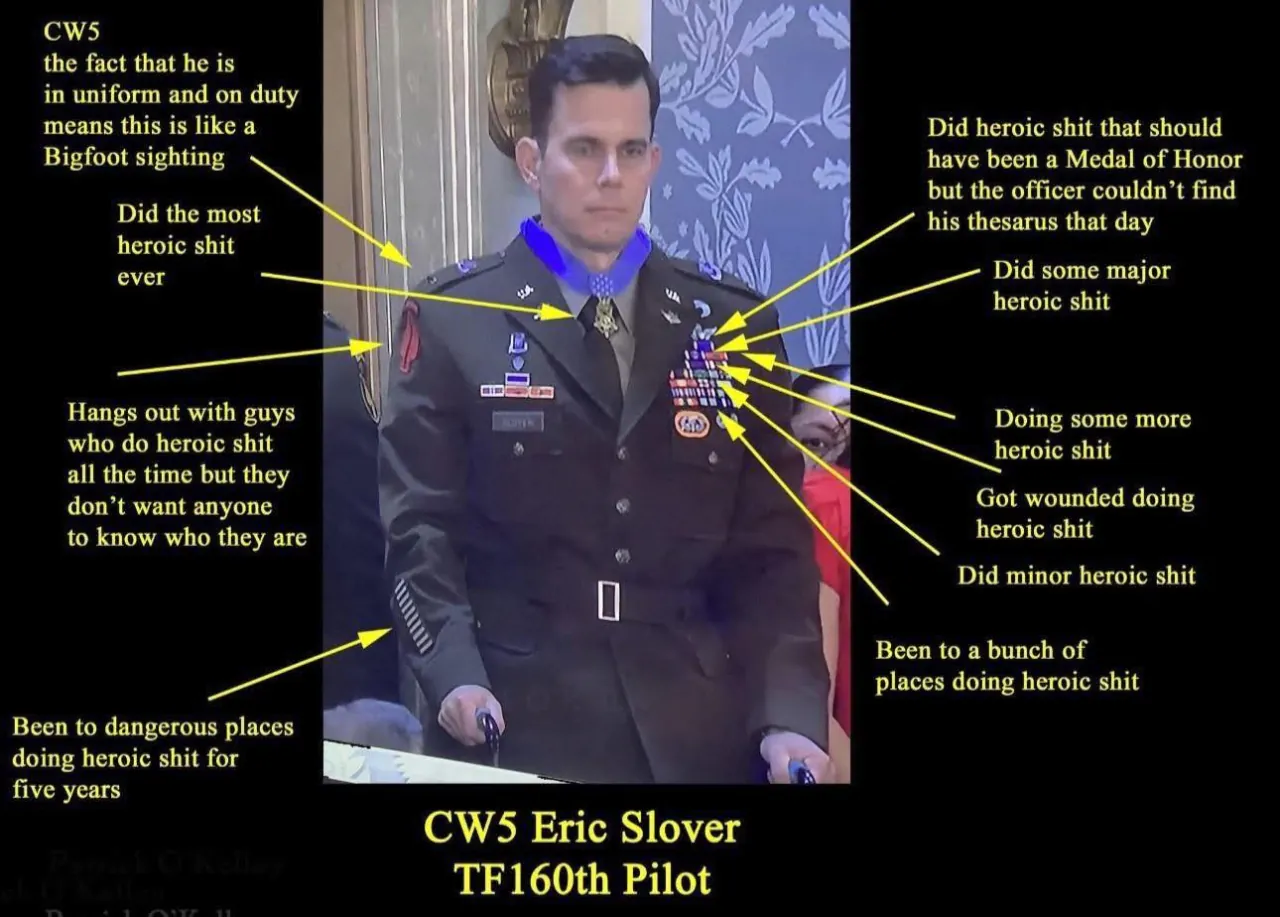걍...생긴것만봐도 참군인을 넘어서 절대 적으로 만나고싶지않게 생긴 슬로버는 '살아서는 받기 힘들다는' 명예훈장 군 경력 20년차에 수여받았는데, 그 가슴에 달린 약장만봐도 그가 얼마나 엘리트인지 알 수 있음.