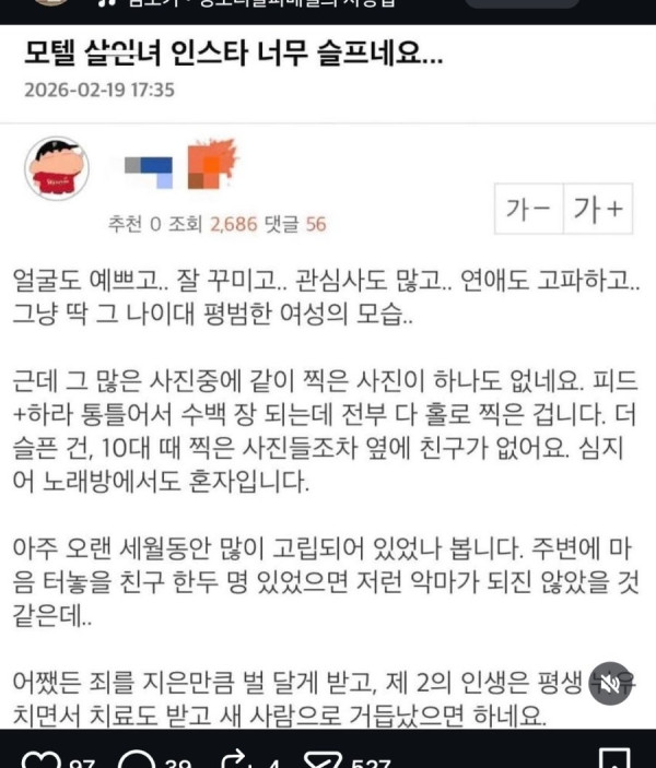 모텔 살인녀 영포티 글 인스타 반응