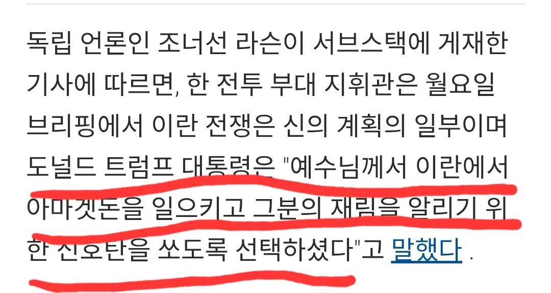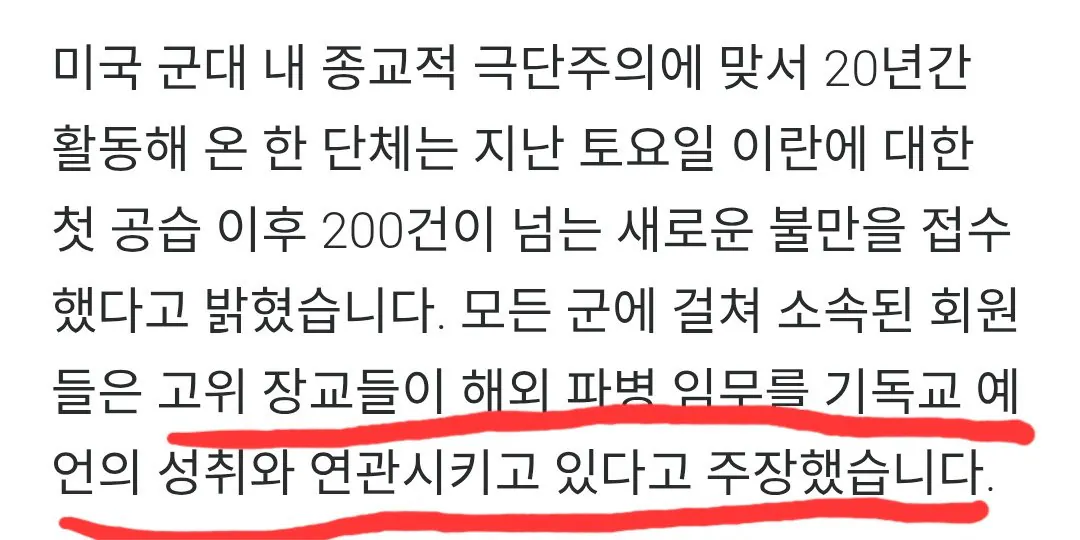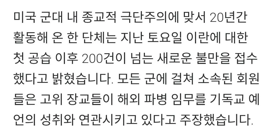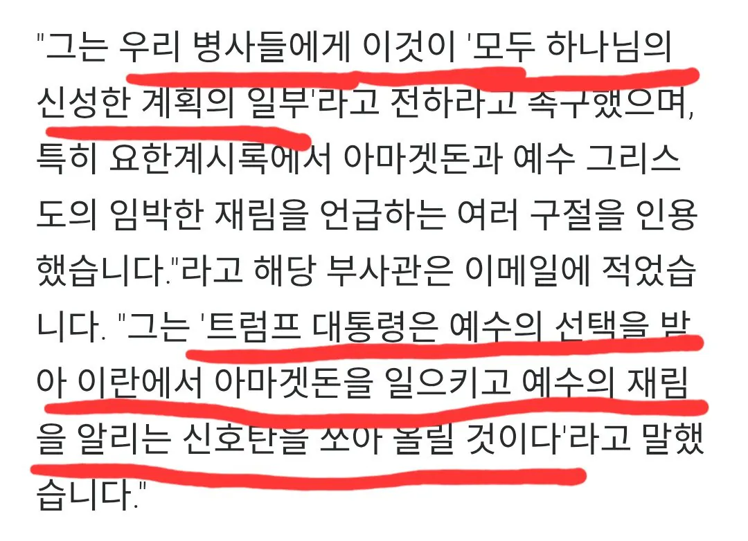 트럼프가 예수의 선택을 받아 그의 대리인으로서 이란과 아마겟돈(결전)을 일으켰으니 전쟁을 두려워하지 마라"는 내용의 정훈교육을 일선 병사들에게 계속 강요한다고 함
