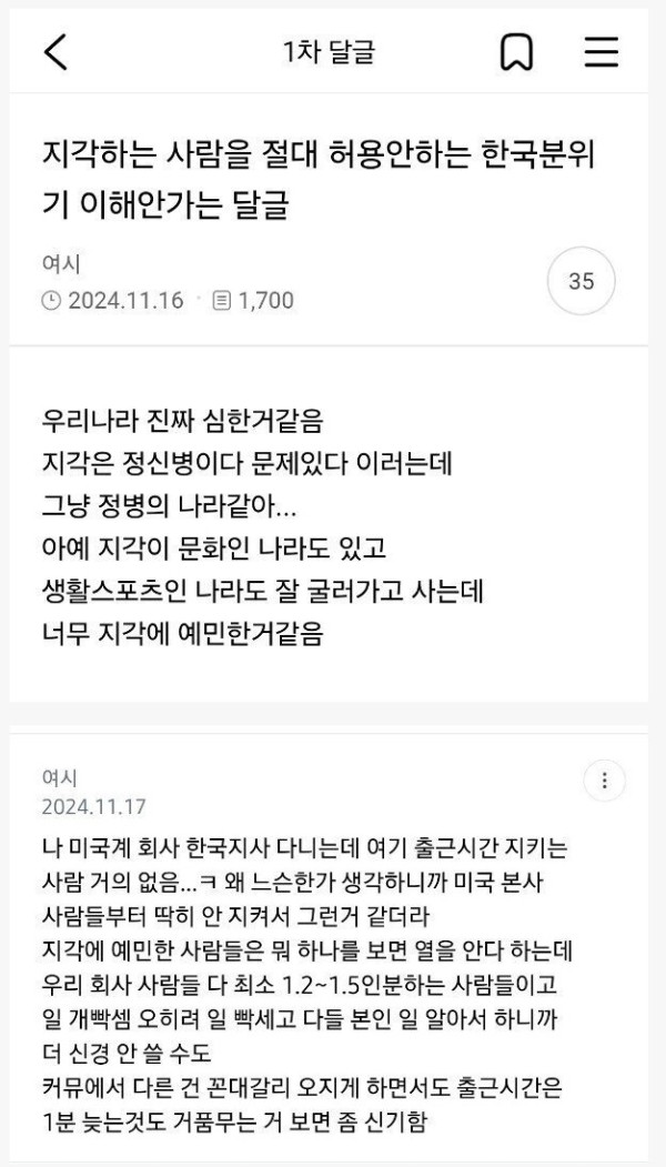 지각하는 사람을 절대 허용안하는 한국분위기