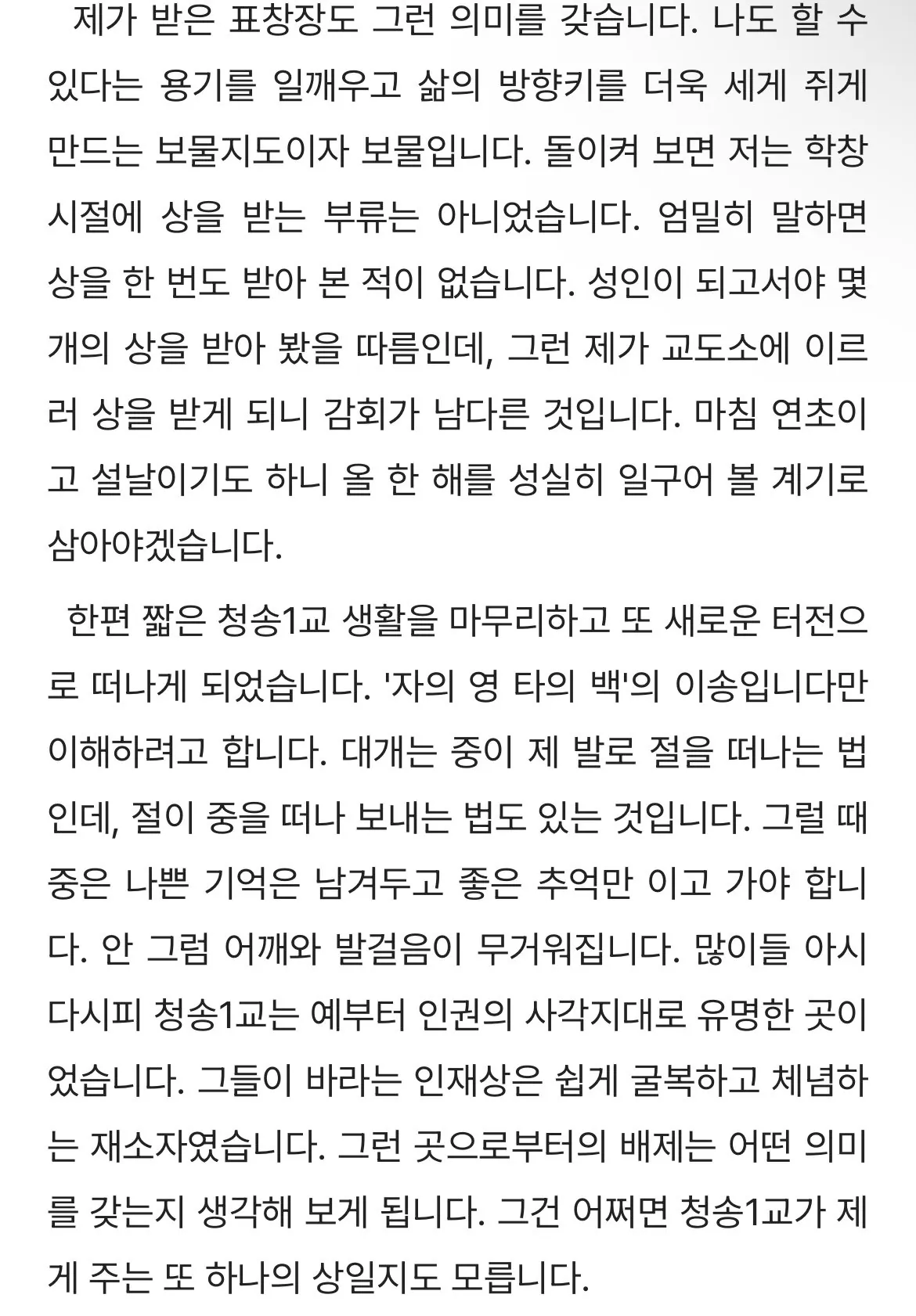 자신의 블로그에 교도소 인성교육 수상소감을 올렸음
