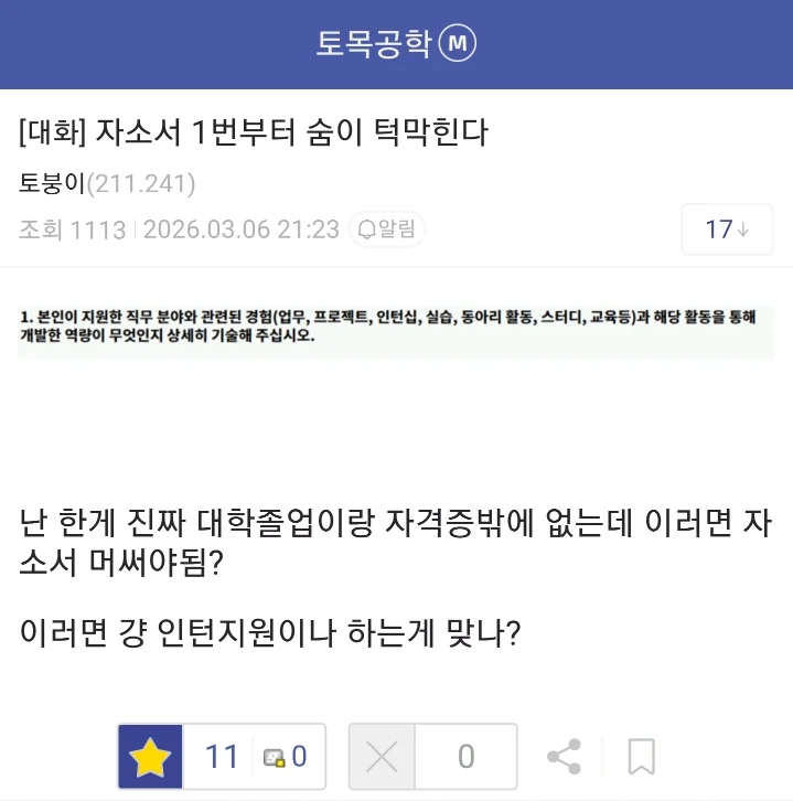취준생인데 자소서 1번부터 숨이 막힌다