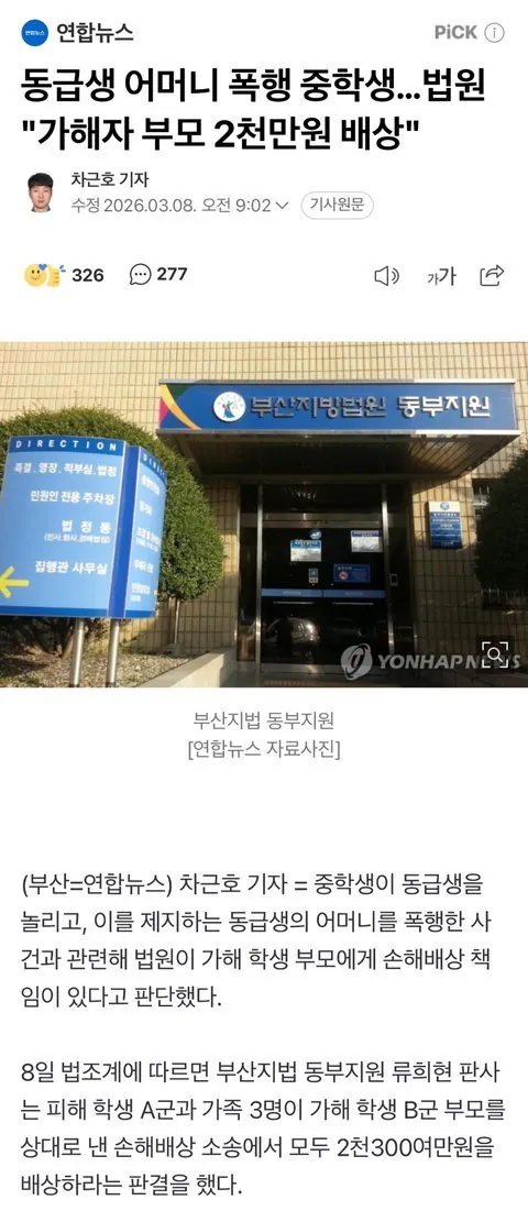 동급생 어머니 폭행 중학생…법원 "가해자 부모 2천만원 배상" | 연합뉴스