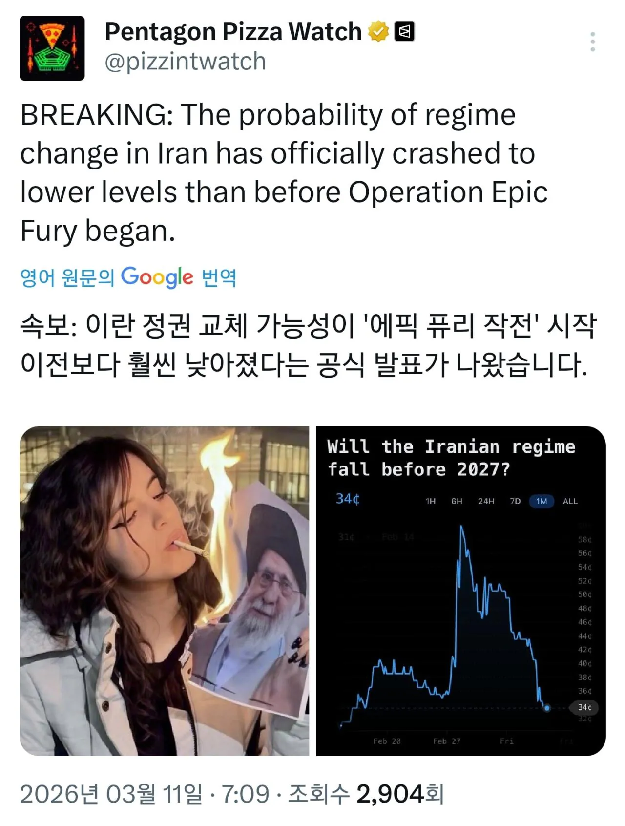 이란 정권 붕괴의 가능성이 급락