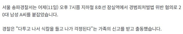 가방에 식칼 숨겨 지하철 탄 20대 남성 체포