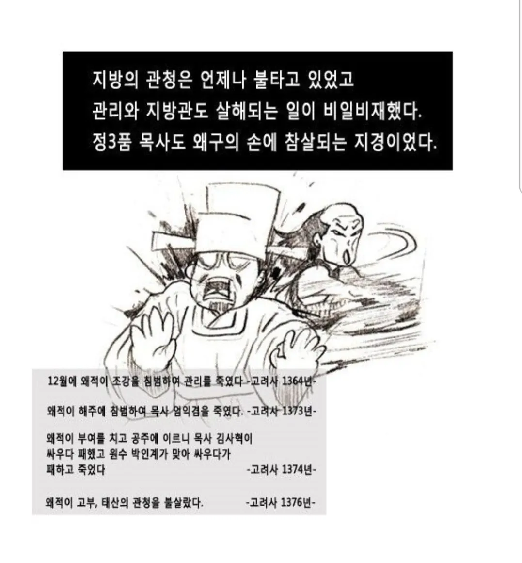 賊掠得二三歲女兒, 剃髮剖腹淨洗, 兼奠米酒祭天. 分左右, 張樂羅拜. 祭畢, 掬分其米而食, 飮酒三鍾, 焚其兒, 槍柄忽折.왜적은 두세 살 정도 되는 여자아이를 납치해다가 머리를 삭발시키고 배를 갈라 쌀을 그 안에 넣어 점을 치고 하늘에 제사를 지냈는데... 술을 석 잔씩 마신 다음 그 아이를 불에 태우니...《고려사》 권126, 열전 제39