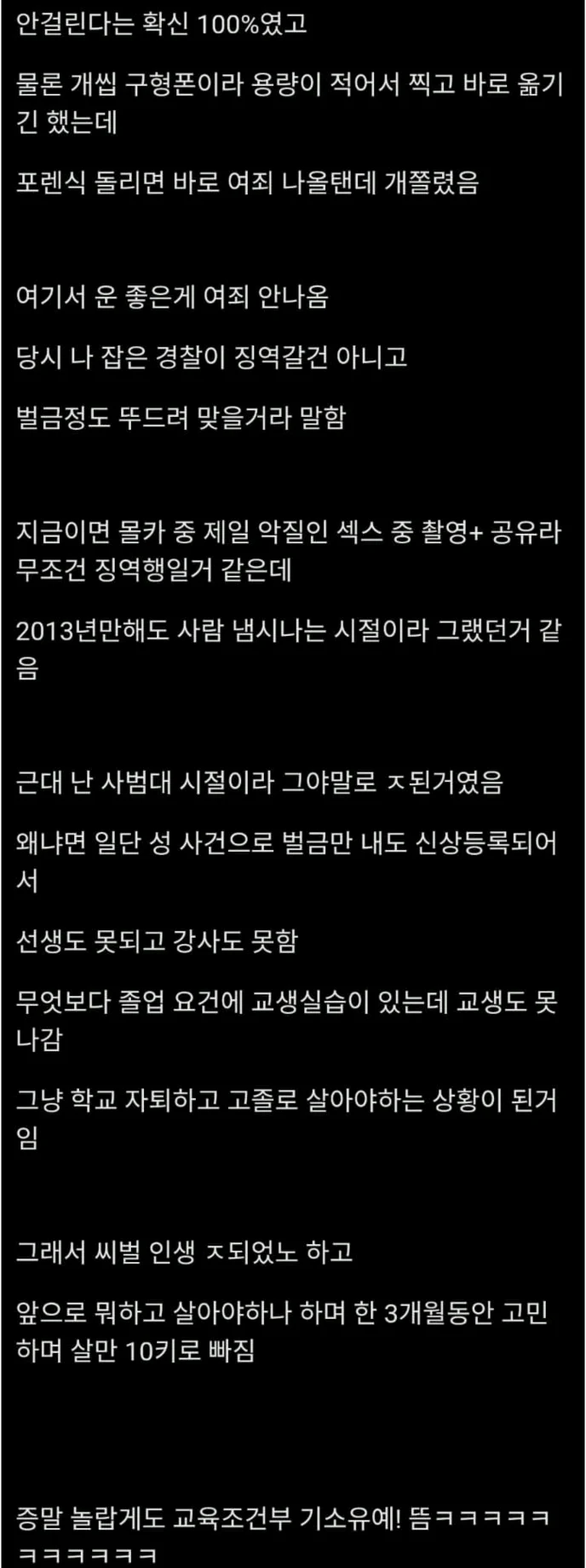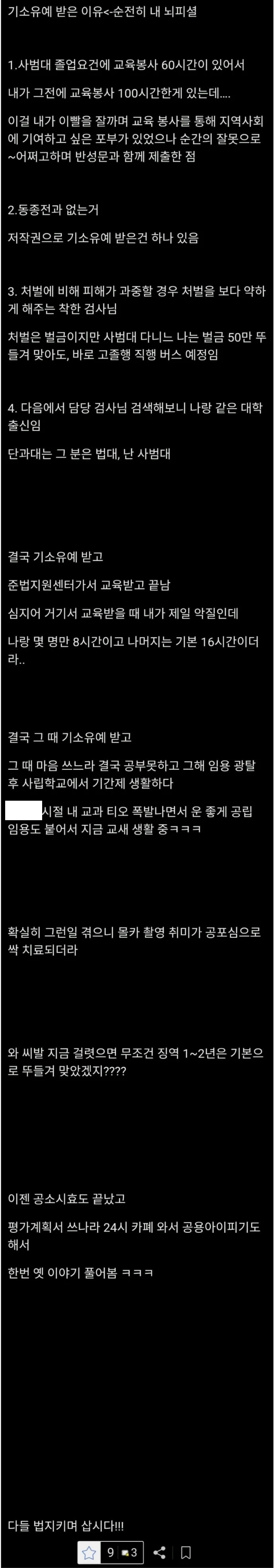 3. 당시 사범대생이였는데 봉사이력,반성문등을 작성하였고 벌금을 받아서 교사를 못해야되지만 운이 좋아서 기소유예를 받음