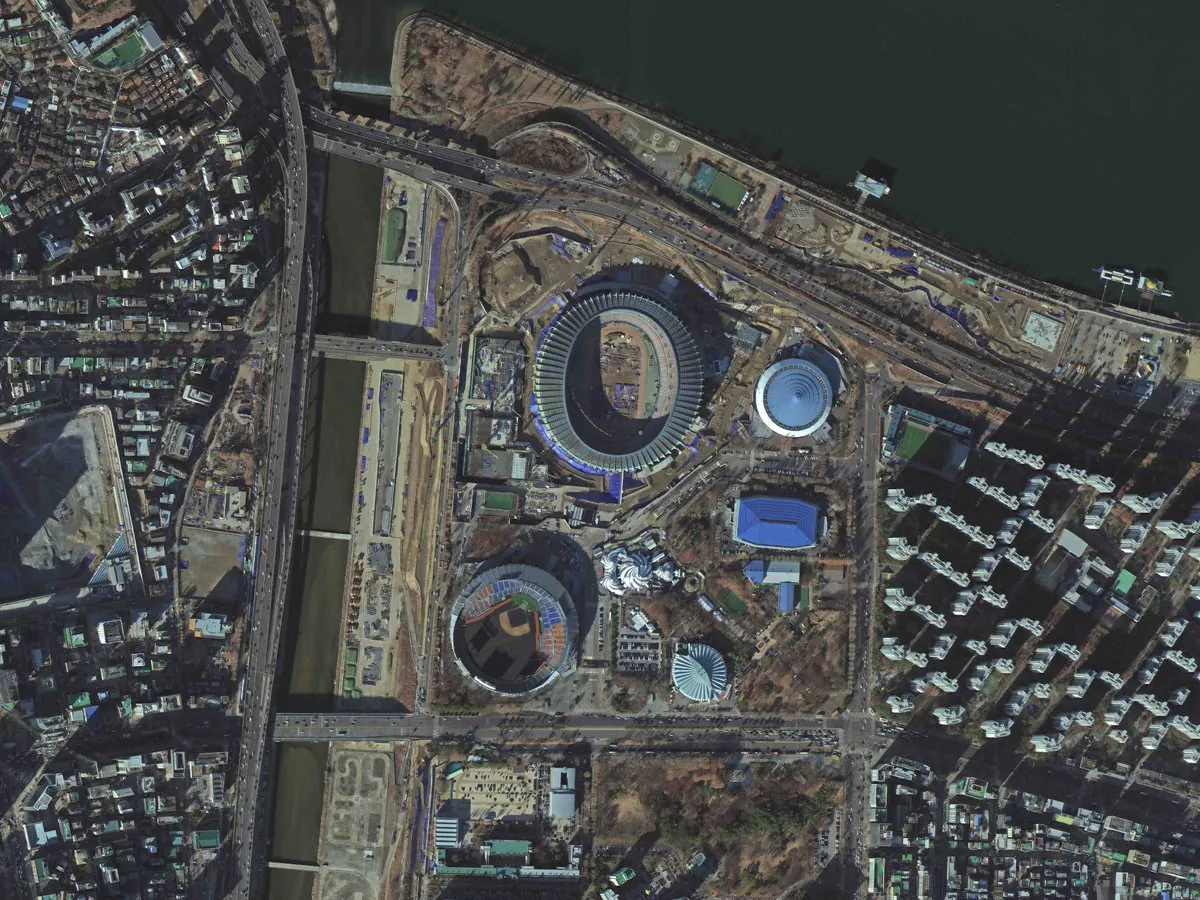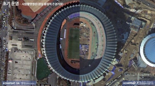 선명하게 보이는 오른쪽 사진이 2025년 12월에 찍은 경기장(아리랑 7호)