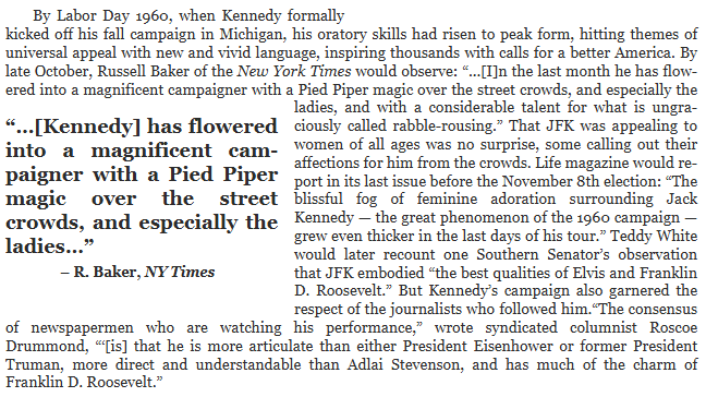 | 10월 말 무렵, 뉴욕 타임스의 러셀 베이커는 다음과 같이 관찰했습니다. “...지난 한 달 동안 그는 거리의 군중, 특히 여성들에게 피리 부는 사나이와 같은 마법을 부리는 화려한 선거 운동가로 거듭났으며... 흔히 야박하게 민중 선동이라 불리는 분야에서도 상당한 재능을 보였다.”
