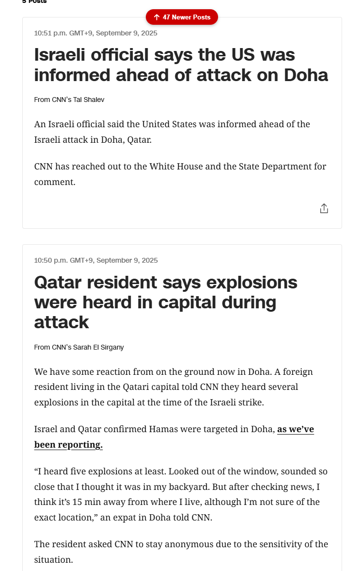 더 충격적인 사실은, 이스라엘은 카타르를 공습하기 50분전 백악관에게 이를 통지했다고 주장했고, 로이터를 통한 백악관당국자도 이를 통지받았다고 했던것 '친미국가이자 미군기지까지 있는 미국의 동맹국폭격을 미국이 사실상 방관했다' 라는 사실은 전중동국가들에게 충격을 줬음
