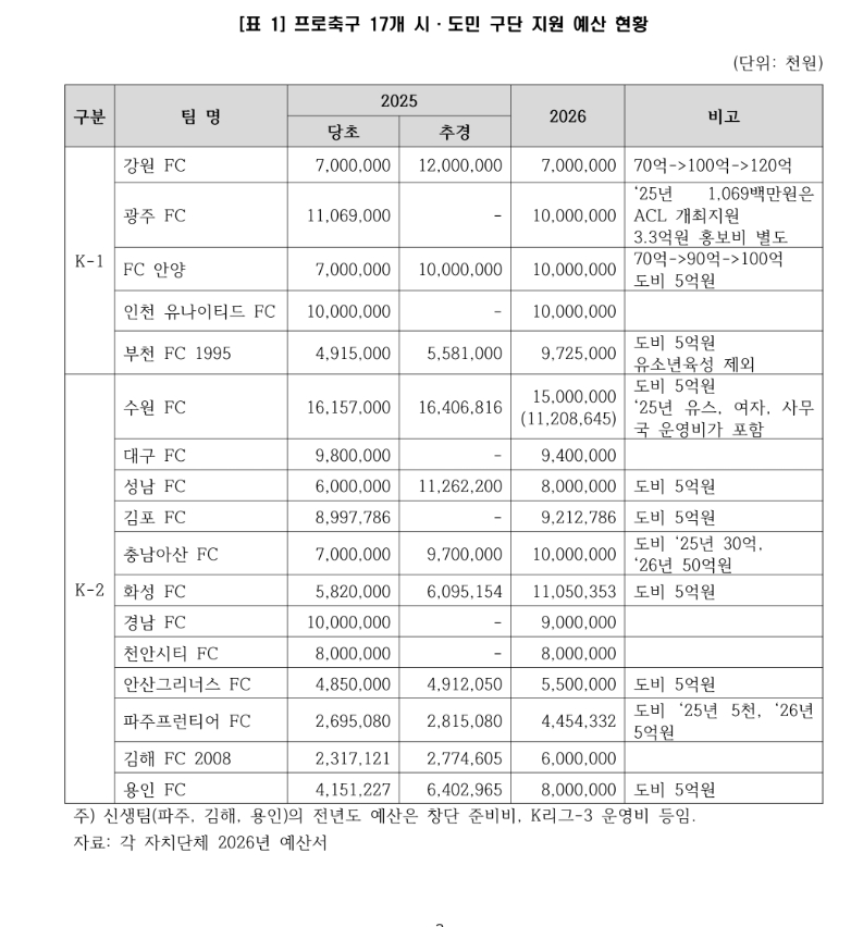 2026년 프로축구 시민구단 예산 근황
