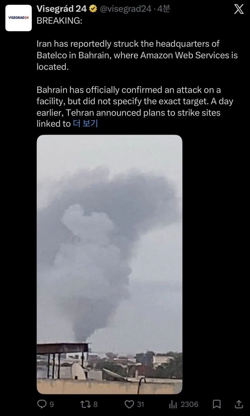 이란이 아마존 웹 서비스(AWS)가 입주해 있는 바레인의 바텔코(Batelco) 본사를 타격한 것으로 알려졌다.