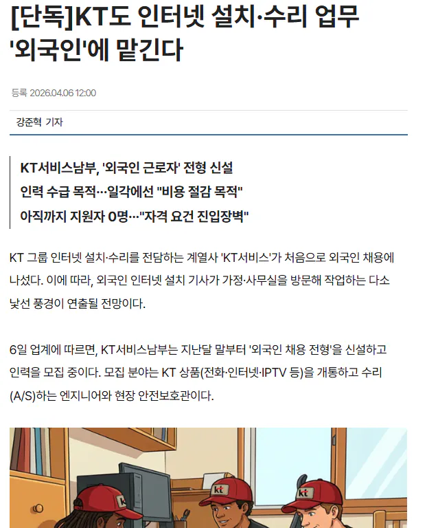 KT도 인터넷 설치·수리 업무 '외국인'에 맡긴다