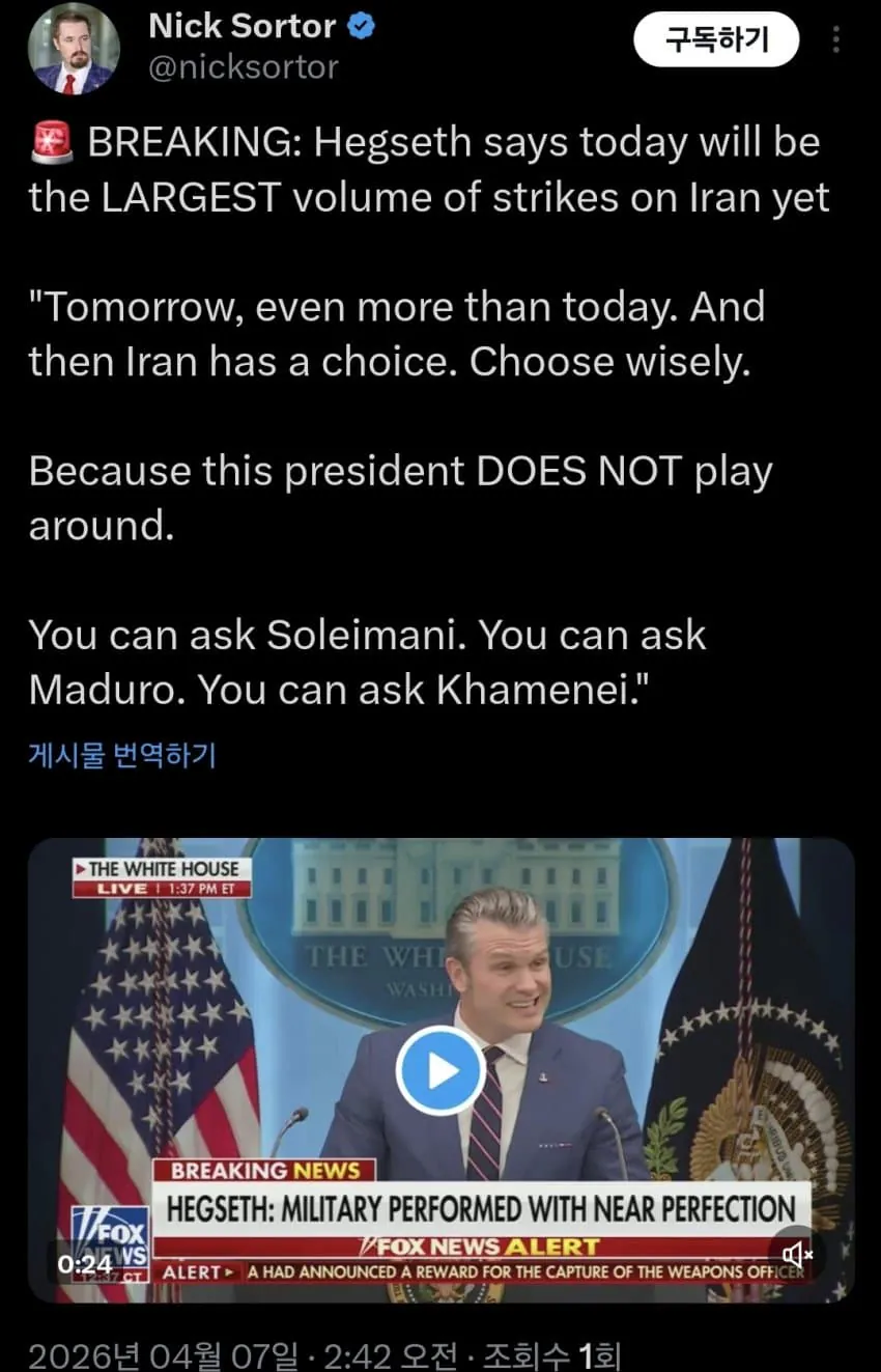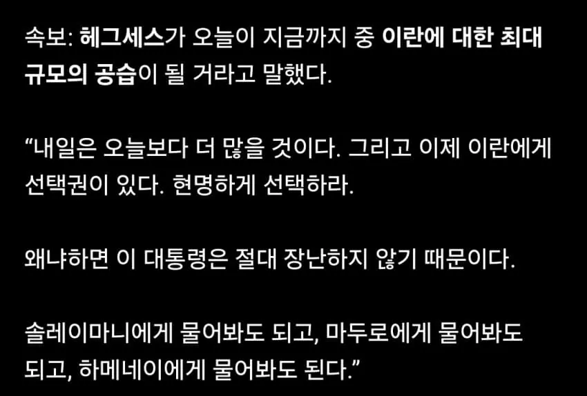 미국 국방장관 : 오늘 이란 최대 규모 공습