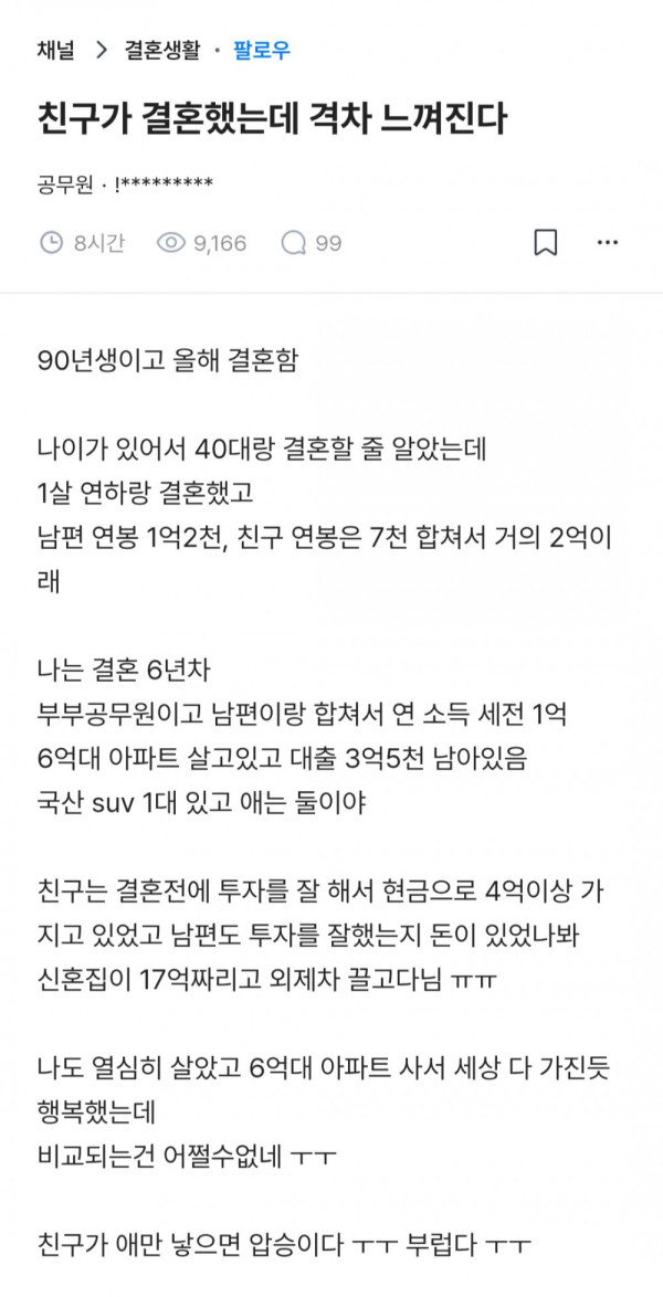 친구가 결혼했는데 격차 느껴진다