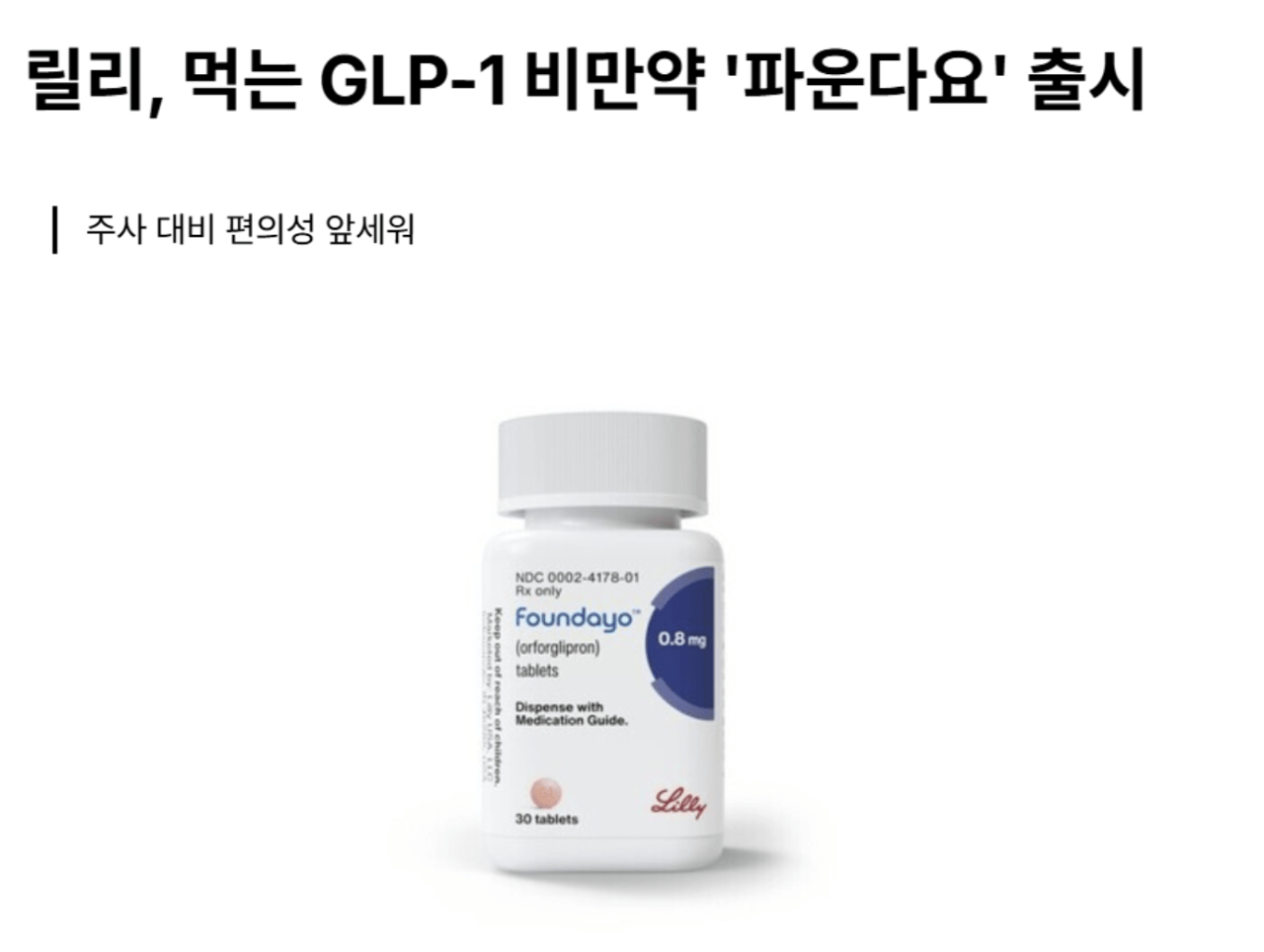 일라이 릴리가 이번에 마운자로 먹는 버전 출시 파운다요(Foundayo) 4월 1일 FDA 승인 받고 바로 판매 시작 최고 용량 기준으로 72주 동안 "평균" 12.4kg 감량 출처 https://www.leadeconomy.co.kr/news/articleView.html?idxno=7074 비만은 이제 정복인듯ㄷㄷ 먹는 GLP-1 비만약 드디어 나왔다