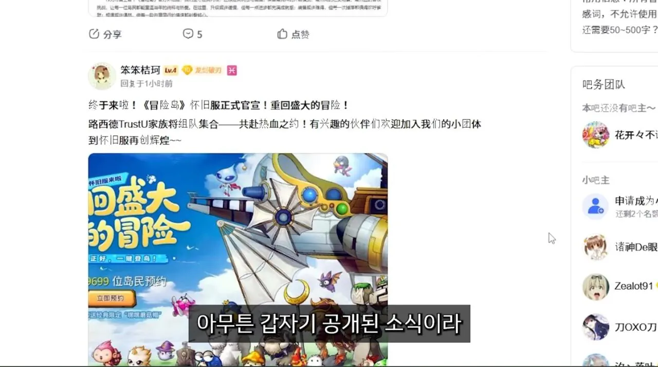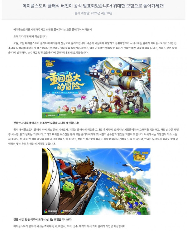 넥슨에서 갑자기 공식으로 중국 클래식 메이플 소식 올림