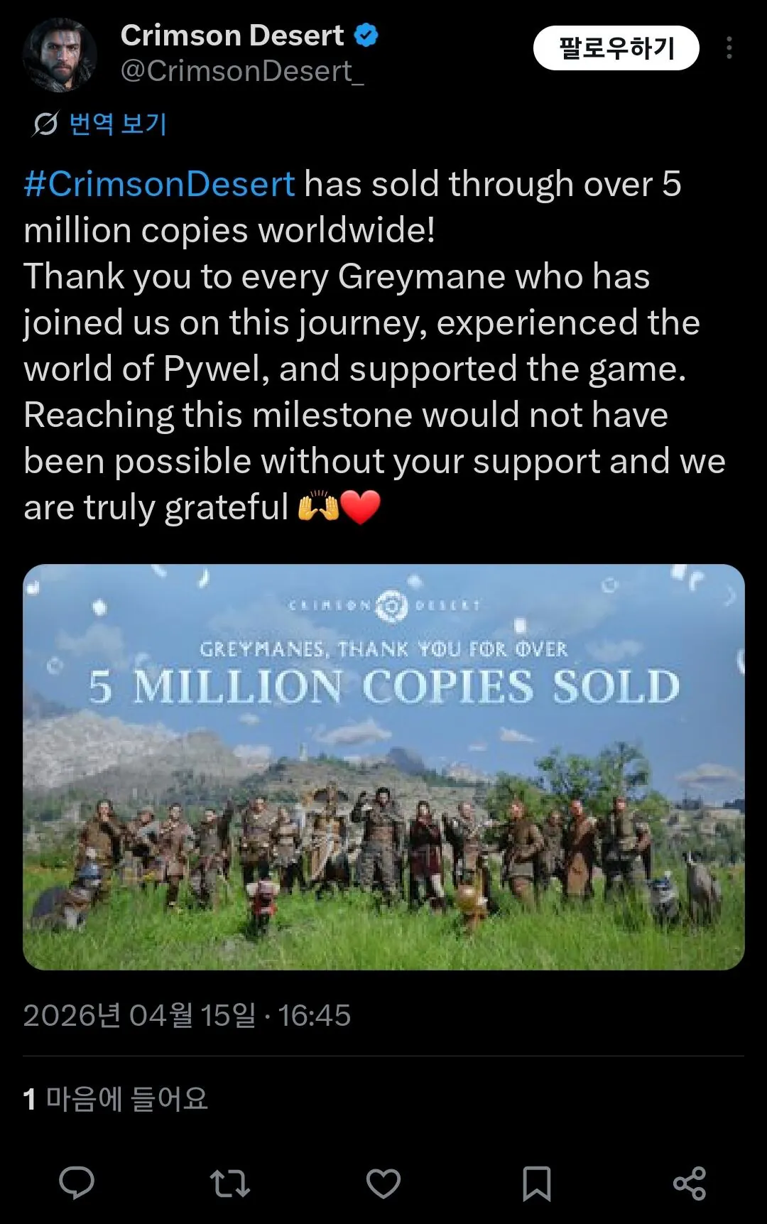 오피셜) 붉은 사막 500만장 판매