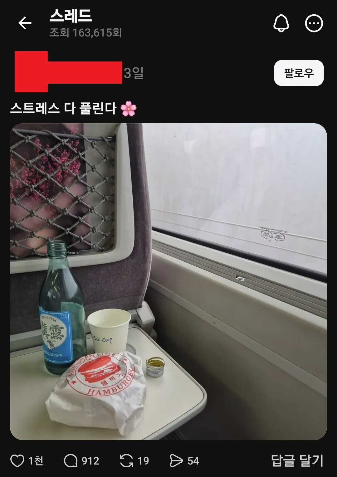 KTX에서 소주먹는걸 스레드에 올린 당당한 여자