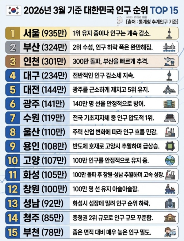최신자 대한민국 도시 인구 순위