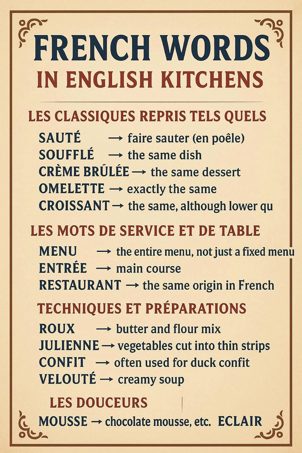 Sauté, Cuisine, Chef등이 대표적인 프랑스에서 발원한 요리 용어. 이는 보다 가문과 셰프 중심이던 이탈리아와 조금 더 차별성을 가지는 부분으로 프랑스 요리의 체계화는 프랑스 혁명 이후 한층 더 발전.
