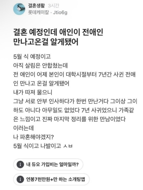 결혼 예정인데 예비신부가 전남친 만나고 온걸 알게 됨