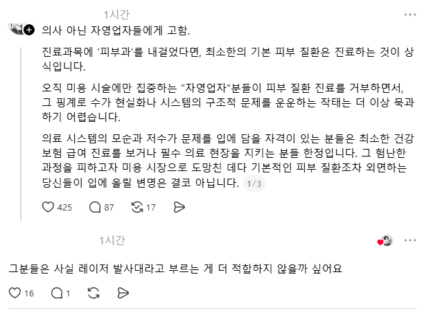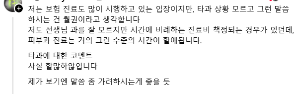 댓글로 피부과 진료 거부당한 경험담들과 수가 때문에 어쩔 수 없다고 항의하는 의사들 댓글 달리는 중