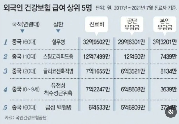 외국인 건강보험 급여 상위 5명 국적