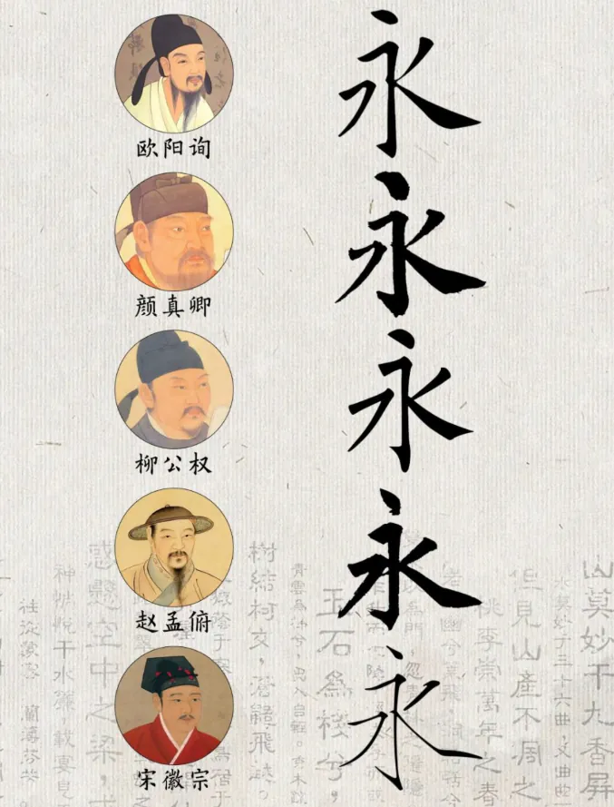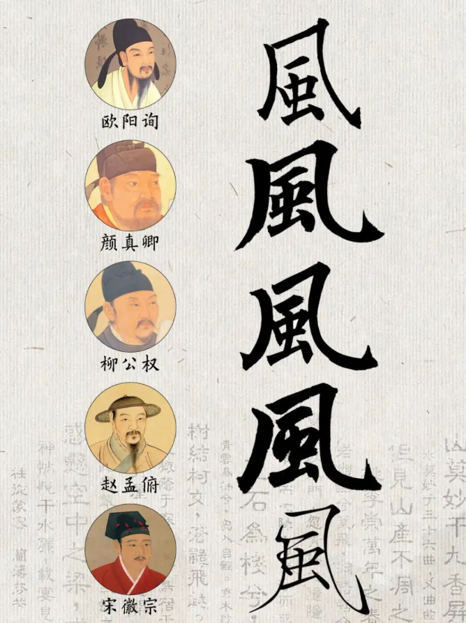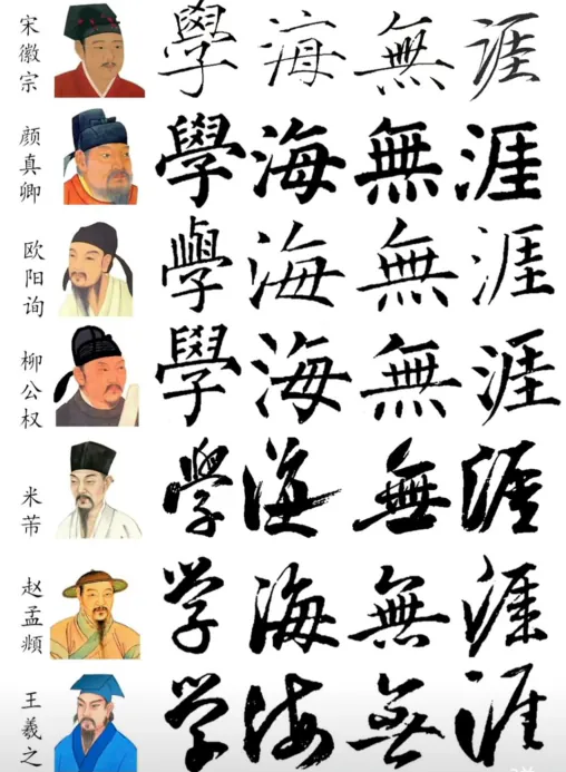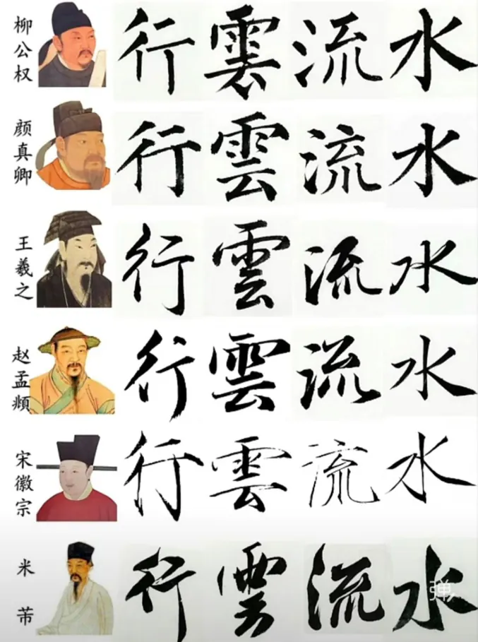 왕희지(동진) → 구양순(당) → 안진경(당) → 류공권(당) → 미불(북송) → 송휘종(북송 말) → 조맹부(원)