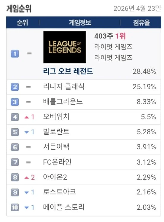 현재 롤이랑 PC방 점유율 1위 경쟁중인 게임