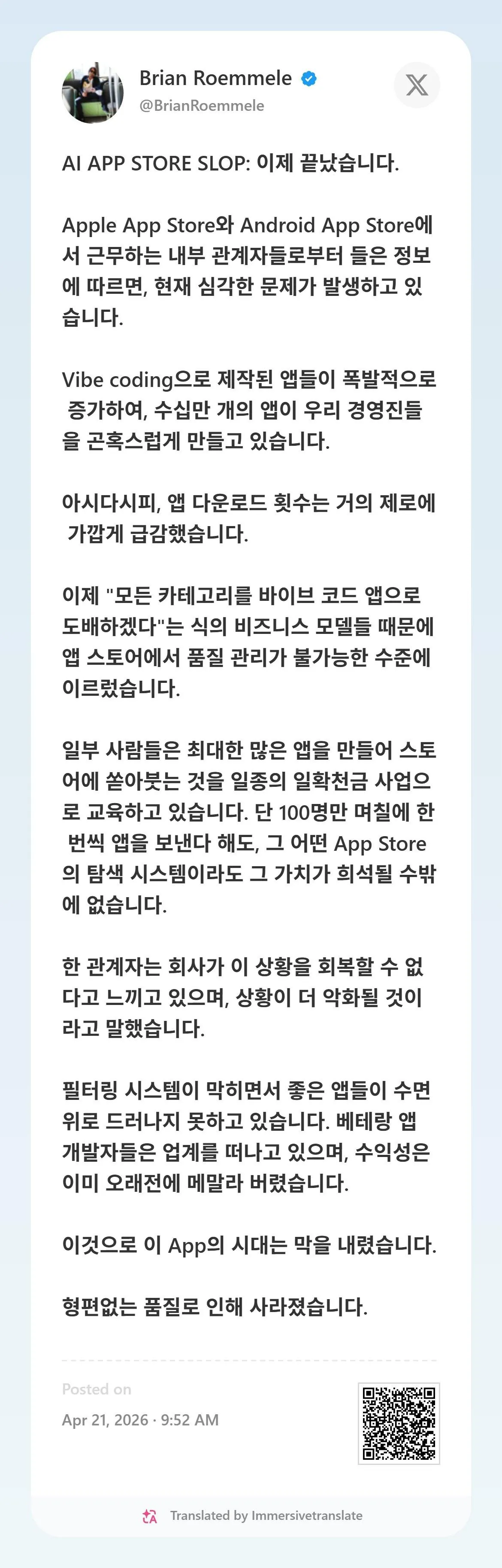현재 ai로 막 찍어낸 저질 앱들을 거를수가 없게되면서 점점 앱스토어 시장이 망해가고 있다고함