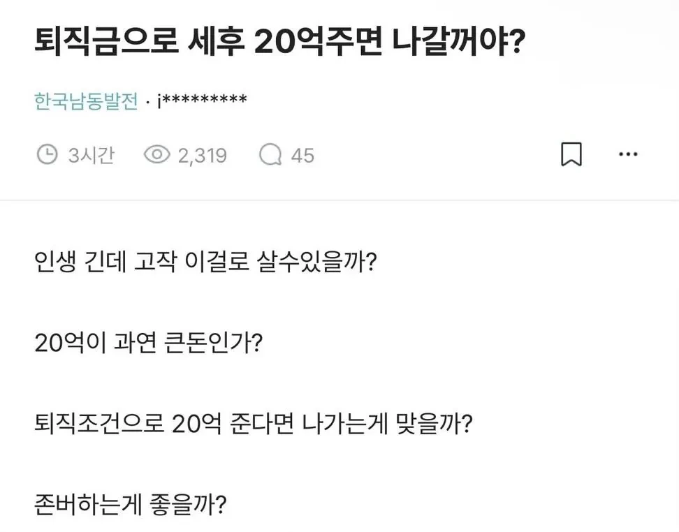 퇴직금으로 세후 20억 주면 나갈 거야?