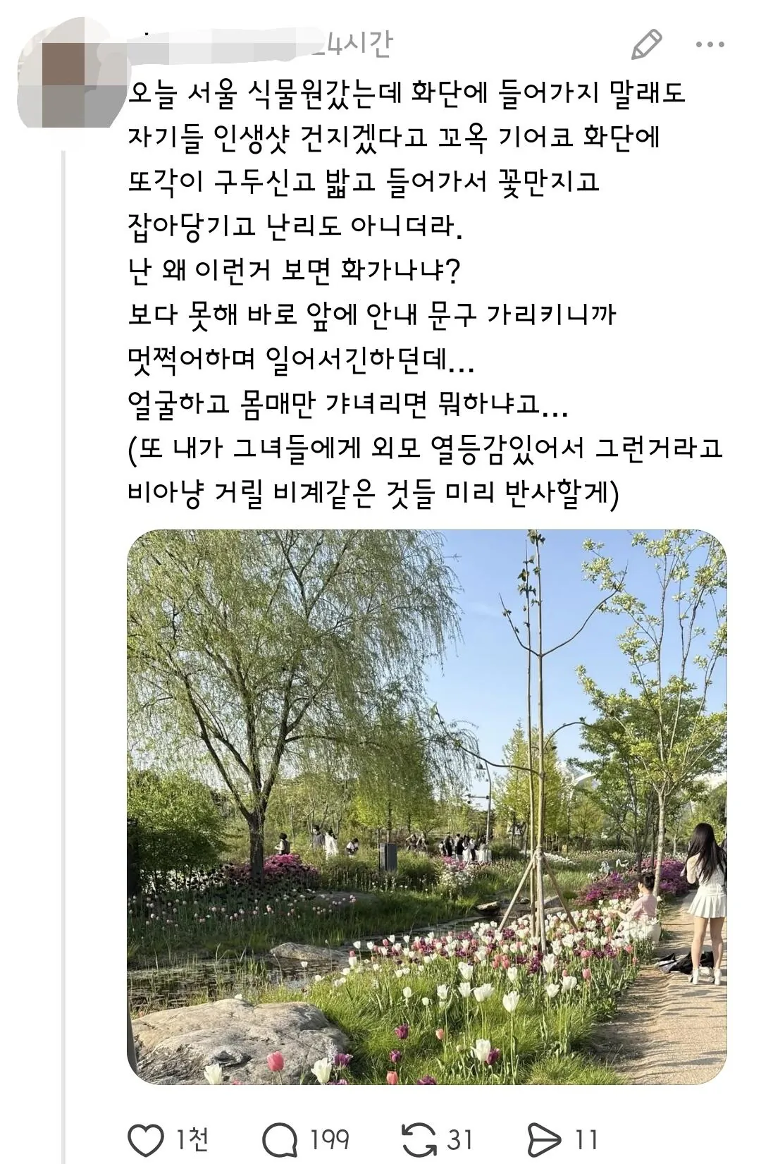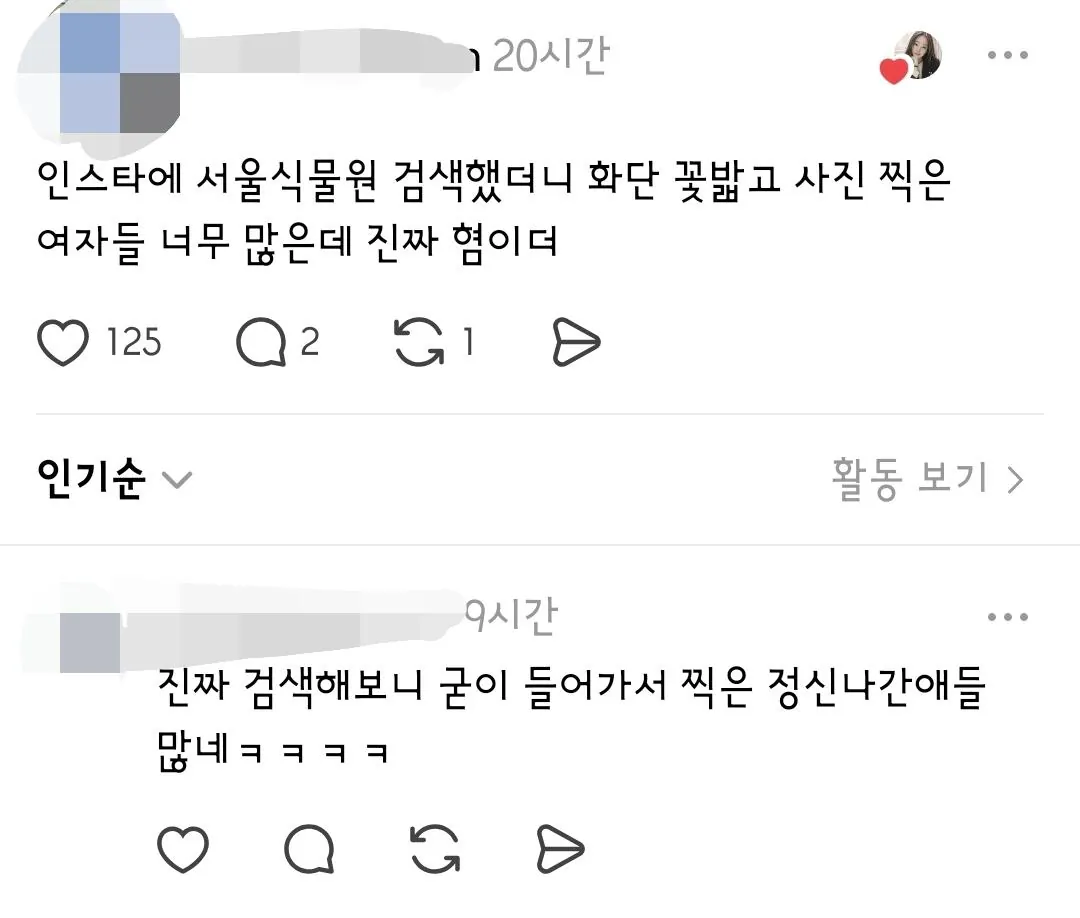 인스타에 서울식물원 검색하면 경고문 무시하고 들어가서 찍은 사진들 굉장히 많다고함.