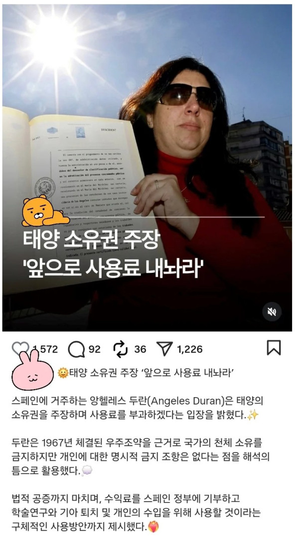 태양 소유권 주장 '앞으로 사용료 내놔라'