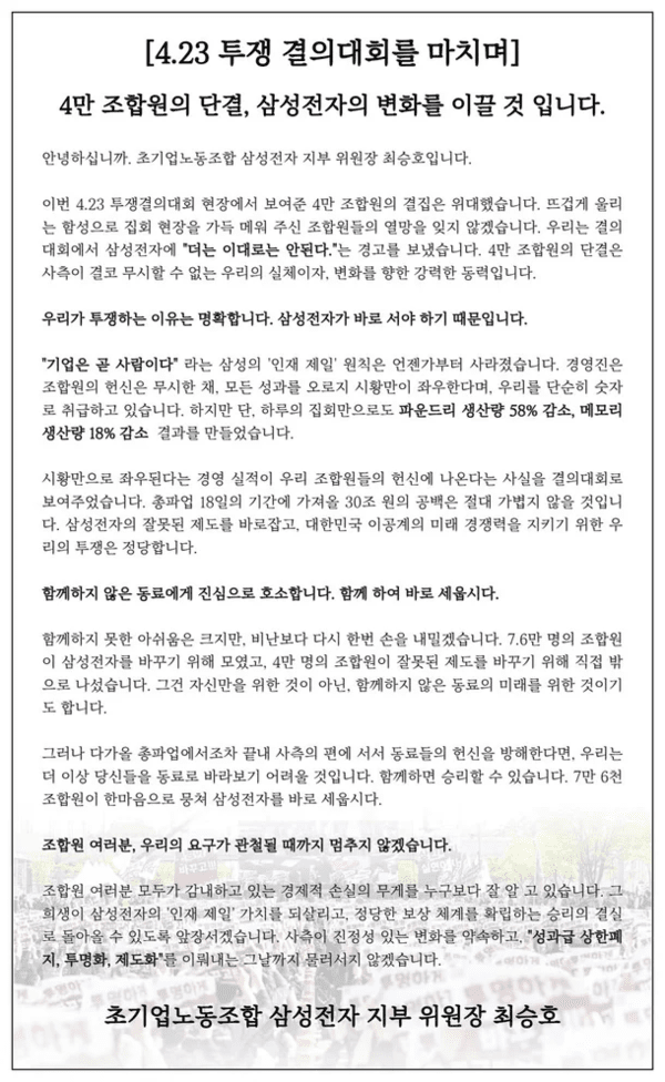 삼성 노조 "총파업에서 사측편 서면 동료 아냐"