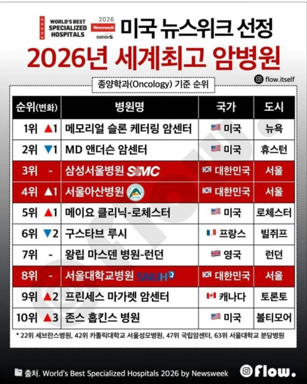 미국 뉴스위크 선정 2026년 세계 최고 암병원 순위
