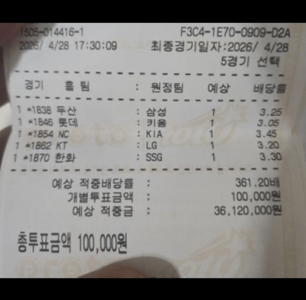 KBO 개막 이후 전 경기 1점 차 나온 것도 신기한데, 거기에 10만 원 풀베팅 박아서 3,600만 원 ㄷㄷㄷ