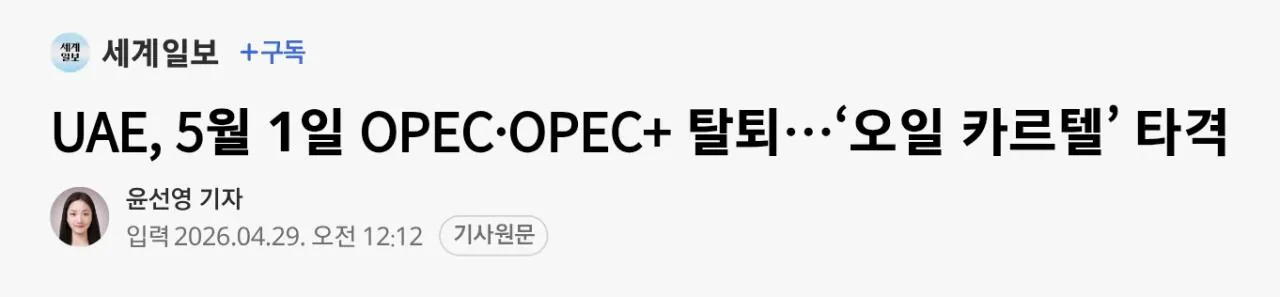 속보) 아랍에미리트(UAE), OPEC(석유수출기구) 탈퇴