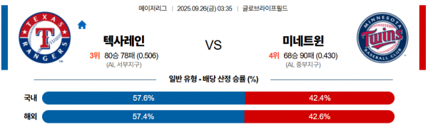 9월 26일 MLB 텍사레인 vs 미네트윈