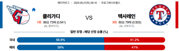 두 팀 모두 현재 타격이 좋다는 말은 빈말로도 할수 없을 정도다. 특히 텍사스는 완벽하게 타격이 가라앉아 있는 상황. 세코니는 홈 경기 강점이 확고한 반면 라이터는 원정에서 힘들다는 점도 승부에 영향을 미칠 것이다. 게다가 텍사스의 불펜은 접전에서 신뢰가 되지 않는 레벨이다. 전력에서 앞선 클리블랜드 가디언즈가 승리를 가져갈 것이다.