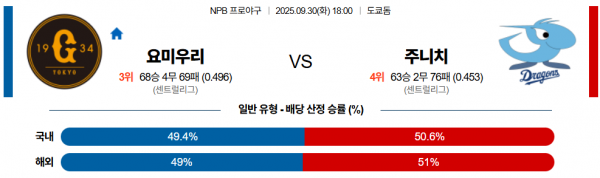 주니치 드래곤즈는 카일 멀러(4승 8패 3.42)가 시즌 5승에 도전한다. 23일 야쿠르트 원정에서 5.1이닝 무실점의 호투로 승리를 거둔 멀러는 원정의 부진을 훌륭하게 극복하는데 성공해 보였다. 이번 시즌 요미우리 상대로 근 5달만의 재대결인데 주니치 투수 답지 않게 돔구장 약점이 있다는 점이 걸린다. 일요일 경기에서 이하라의 투구에 막혀 있다가 9회초 집중타를 터트리면서 4점을 올린 주니치의 타선은 9회초의 몰아치기가 상당히 컸다. 마지막에라도 힘을 내는게 어딘가 싶을 정도. 2이닝동안 무실점으로 버틴 불펜은 내년에도 기대를 해도 좋다.