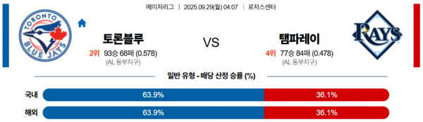 토론토 블루제이스는 케빈 가즈먼(10승 11패 3.47)이 시즌 최종전의 선발로 마운드에 오른다. 24일 보스턴과 홈 경기에서 5.2이닝 4실점의 부진한 투구로 패배를 당한 가즈먼은 앞선 3경기의 호조가 깨진게 아쉬움이 있는 편이다. 탬파베이 상대로 원정에서 6이닝 1실점 호투를 해냈는데 낮 경기 약점을 극복해야 한다. 전날 경기에서 보일을 공략하면서 커크의 솔로 홈런 포함 5점을 올린 토론토의 타선은 홈 경기의 집중력을 유지하고 있는 중. 하위 타선이 활발해졌다는건 긍정적인 요소다. 4이닝동안 1실점을 허용한 불펜은 이 흐름을 유지해야 한다.