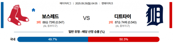 전날 승리로 디트로이트는 가을 야구를 확정지었다. 이번 경기는 두 팀 모두에게 큰 의미는 없을듯. 특히 디트로이트는 승리해도 클리블랜드 승리시 지구 1위는 불가능이라는 점이 좋지 않은 부분. 보스턴의 불펜 자체는 좋은 편이고 선발 패덱도 기대가 어렵다. 힘에서 앞선 보스턴 레드삭스가 승리를 가져갈 것이다.