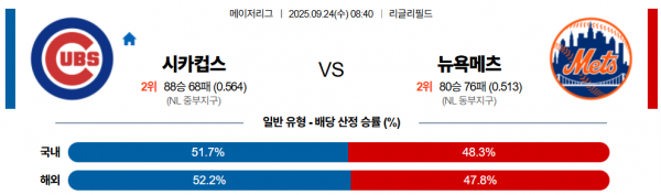 9794 국내야구분석 9월 26일 MLB 시카컵스 vs 뉴욕메츠 등급아이콘 레벨아이콘 커뮤관리자 09.25 271